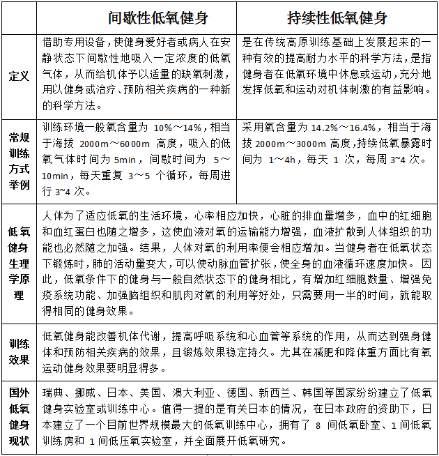 “有氧健身”、“有氧操”等運(yùn)動(dòng)早已是人們所熟悉的健身方式。然而,隨著低氧研究的不斷深入,有些專(zhuān)家提出反其道而行,建議大力普及低氧健身,并且在此方面做了很多研究,取得豐碩成果。低氧健身是應(yīng)用自然或人工方法使機(jī)體在氧氣含量低于正常狀態(tài)下進(jìn)行健身的一種方式。目前,低氧健身作為一種有效提高心、肺功能的訓(xùn)練方法和手段已得到國(guó)內(nèi)外專(zhuān)家學(xué)者的認(rèn)同,低氧健身已成為美國(guó)曼哈頓健身業(yè)中最時(shí)尚的健身方法之一,我國(guó)的北京體育大學(xué)、廣州體育學(xué)院等體育院校也紛紛建立起低氧健身房。
