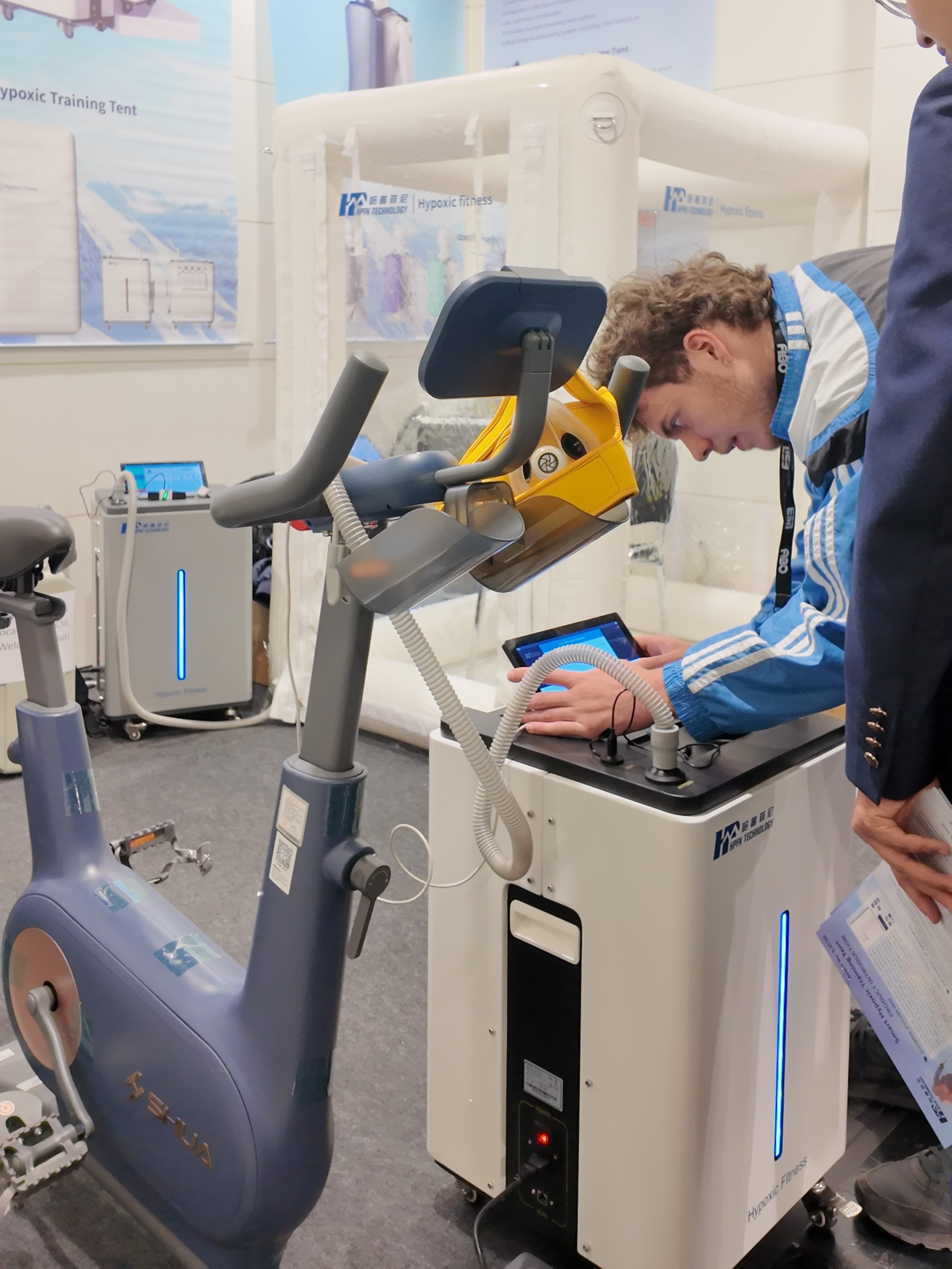 此次展會上,哈普菲尼健身科技有限公司展示了一系列自主研發(fā)的低氧健身設(shè)備。其中,最新款的智能低氧訓(xùn)練帳篷(Smart Hypoxic Training Tent)備受矚目。該帳篷采用了先進(jìn)的智能控制系統(tǒng),能夠精準(zhǔn)模擬不同海拔高度的低氧環(huán)境,從輕度低氧到中度低氧,滿足不同用戶的訓(xùn)練需求。同時(shí),帳篷內(nèi)部配備了舒適的運(yùn)動設(shè)施,如跑步機(jī)、健身自行車等,用戶可以在艙內(nèi)進(jìn)行各種有氧運(yùn)動,享受低氧環(huán)境帶來的獨(dú)特健身體驗(yàn),是團(tuán)隊(duì)訓(xùn)練與個(gè)性化健身的理想之選。