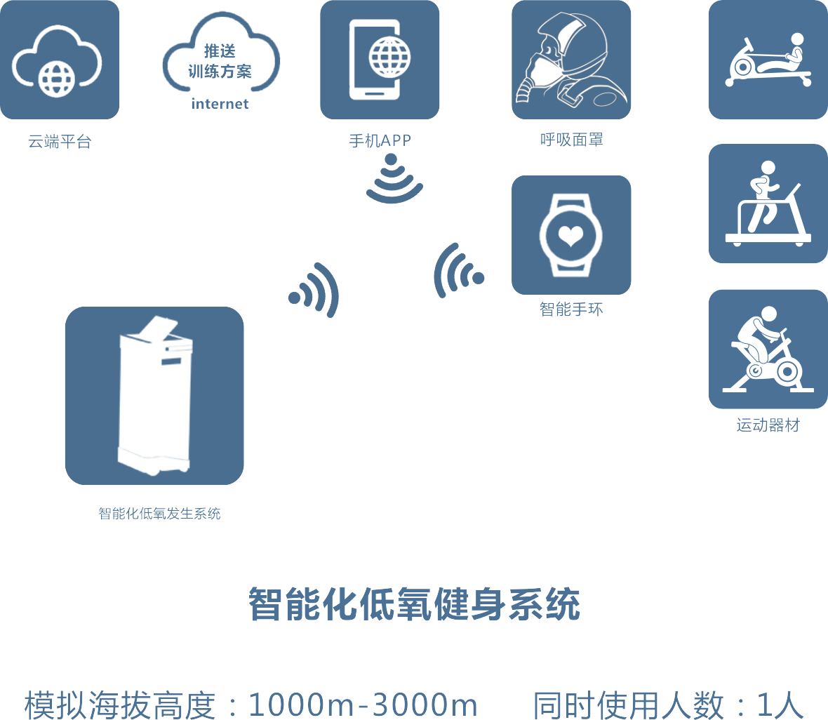 國內(nèi)唯一通過國家權(quán)威CMA檢測認(rèn)定的低氧健身設(shè)備;用人工智能方法使運(yùn)動健身時呼吸的氣體氧含量低于標(biāo)準(zhǔn)大氣壓下氧含量21%,以增加人體對氧的利用率,提高有氧能力;實(shí)時監(jiān)測運(yùn)動健身生理參數(shù)等功能,結(jié)合適度運(yùn)動,實(shí)現(xiàn)強(qiáng)化心肺功能、加速燃脂、優(yōu)化血液、提高耐受力及肌力的作用。